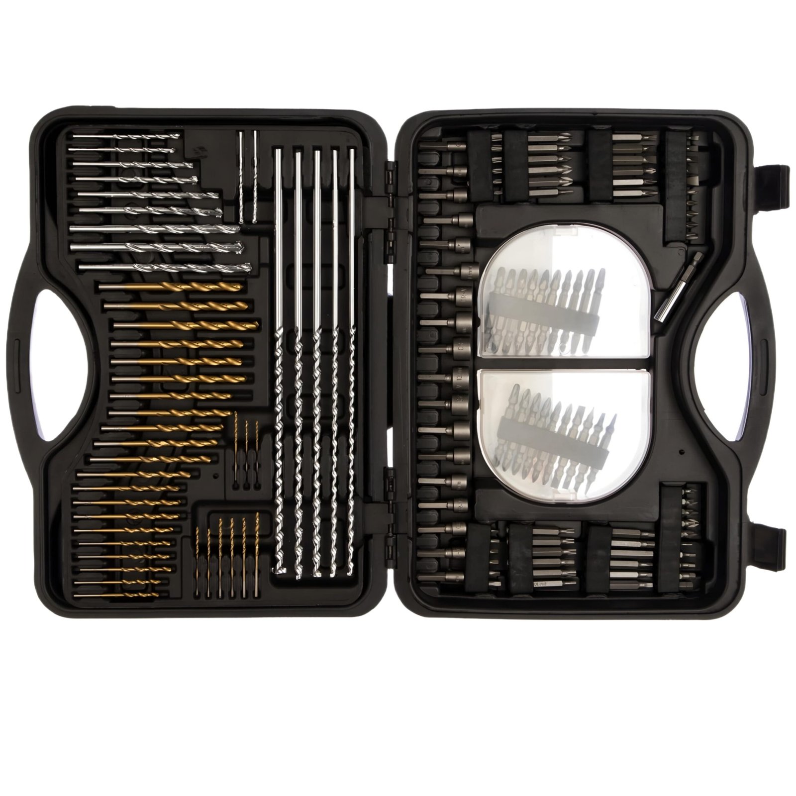 This 176-piece drill accessory set offers a comprehensive selection of tools for various drilling and screwdriving tasks. It contains a diverse range of bits, crowns, socket heads, and other accessories, all conveniently packaged together. Featuring a mix of single and double-sided bits, the set includes drill bits suitable for wood, metal, and concrete surfaces, along with socket heads and crowns for additional versatility. The package also includes essential accessories such as a bit holder, countersink, metal ruler, and a screwdriver-hold for ratchet bits . Crafted from durable materials, these accessories are designed to withstand rigorous use. With its cylindrical drill shank and convenient bit holder, this set offers both efficiency and ease of use. Whether you’re a DIY enthusiast or a professional tradesperson, this drill accessory set provides everything you need for your drilling projects, all in one convenient package.