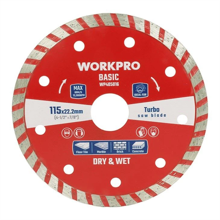 The WORKPRO Turbo Diamond Saw Blade is designed for both dry and wet cutting applications, making it ideal for a wide range of cutting tasks. Suitable for basic cutting of ceramic tiles, porcelain tiles, brick, marble, granite, and other hard materials, this blade ensures fast, smooth, and chip-free cuts. It features cold-pressed turbo teeth and a 65Mn steel body for enhanced durability and precision. The thin edge and core of the turbo blade reduce dust and speed up the cutting process. This blade meets the EN13236 standard and is Germany MPA certified, ensuring high safety and quality standards.