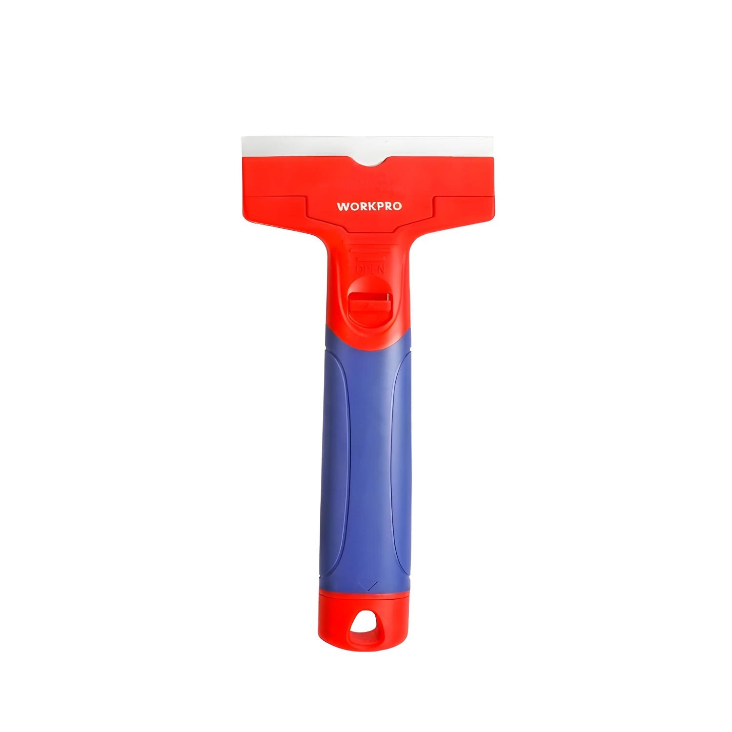 The WORKPRO Glass & Tile Scraper (SKU: WP219002) is a highly efficient cutting tool designed for precision and ease of use. It features a comfortable two-color rubber-coated handle, providing a secure and ergonomic grip for enhanced control and reduced hand fatigue. The scraper is equipped with a quick-change blade function, allowing for fast and easy blade replacements to maintain peak performance. It comes with 5 pieces of blades conveniently stored in the handle, ensuring you always have spares on hand. This scraper is compatible with standard 90mm window scraper blades, making it a versatile tool for various scraping tasks.The tool is packed in a blister on card packaging for retail display, with an outer carton quantity of 72, making it suitable for bulk purchases. The durable construction and practical design of the WORKPRO Glass & Tile Scraper make it an excellent choice for both professional and DIY use, ideal for scraping glass, tiles, and other hard surfaces with precision and ease.