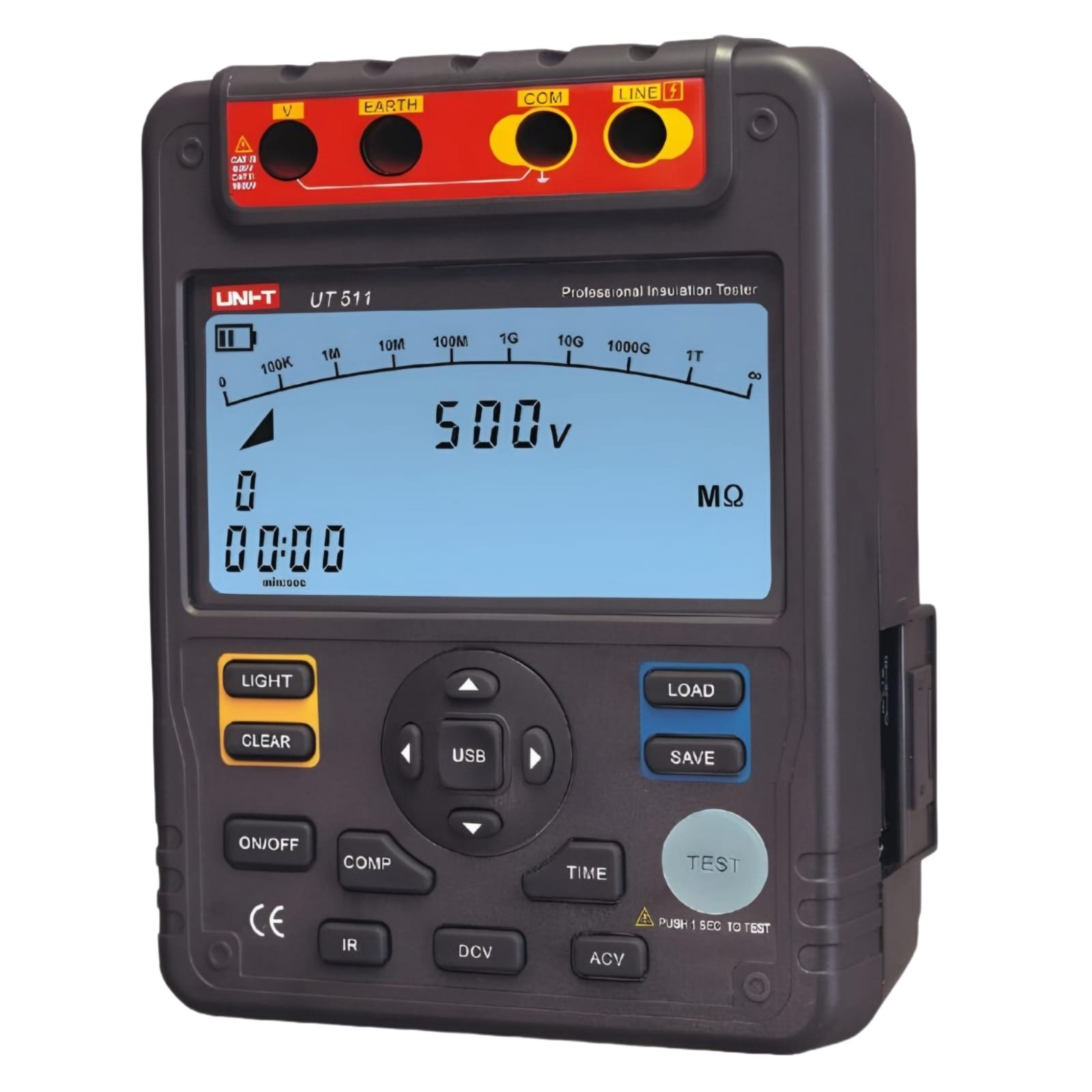 The UT511 insulation tester is a multifunctional device designed to simplify and enhance the process of measuring insulation resistance, polarization index (PI), and dielectric absorption ratio (DAR). With its intuitive interface and robust features, it offers professionals a reliable tool for accurate readings in various applications. Featuring a large 9999 counts display complemented by a 30-segment analog bar graph, the UT511 ensures clear visualization of measurements. Its capabilities extend to comparison functions, upper and lower limit settings, and a continuous measurement mode, providing versatility and precision. Additionally, the instrument incorporates time measurement mode, auto range, and auto measure function, streamlining the testing process. With the capacity to store up to 18 data groups, it facilitates efficient data management, while indicators for low battery and over-range conditions ensure consistent performance. Safety is prioritized with features like the auto power-off function and high-voltage output alarm. Whether in industrial settings or fieldwork, the UT511 stands as a dependable choice for professionals seeking high-quality insulation resistance testing.